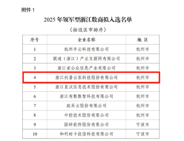 近日,浙江省經(jīng)濟(jì)和信息化廳公布《關(guān)于2025年浙江數(shù)商入選名單(領(lǐng)軍型、成長型)》,浙江托普云農(nóng)科技股份有限公司(股票簡稱:托普云農(nóng),股票代碼:301556)憑借在智慧農(nóng)業(yè)大數(shù)據(jù)領(lǐng)域的持續(xù)創(chuàng)新與實踐成果,成功入選!